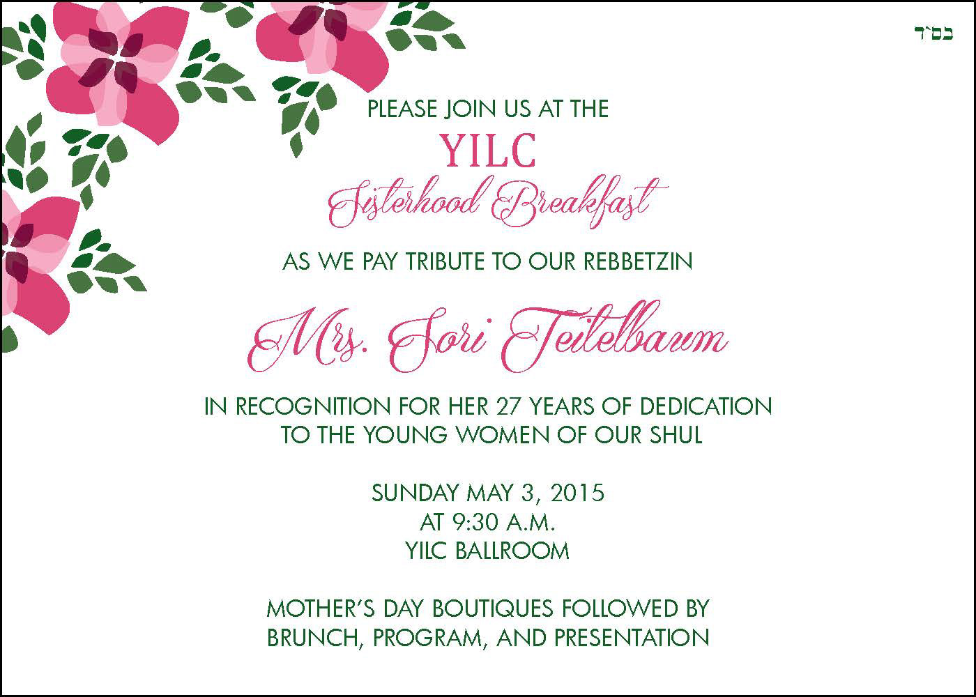 Invitation suite for Young Israel Sisterhood Breakfast.
